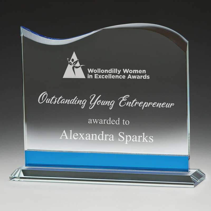 The Blue Tidal Glass Award features a distinctive wave shape with prominent blue glass panel framing the area for engraving. A unique glass award design that may be appropriate to your industry or field of activity. Supplied in presentation gift box.