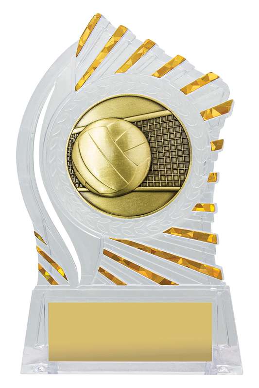 Exciting design of acrylic trophy showcases the gold theme for your sport or trophy. An affordable award with terrific space for your engraving.
