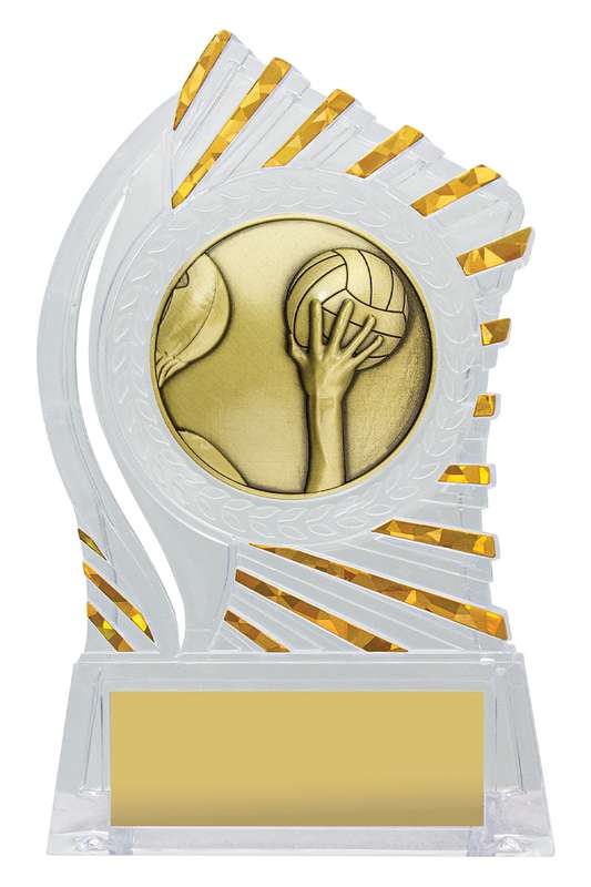 Exciting design of acrylic trophy showcases the gold theme for your sport or trophy. An affordable award with terrific space for your engraving.